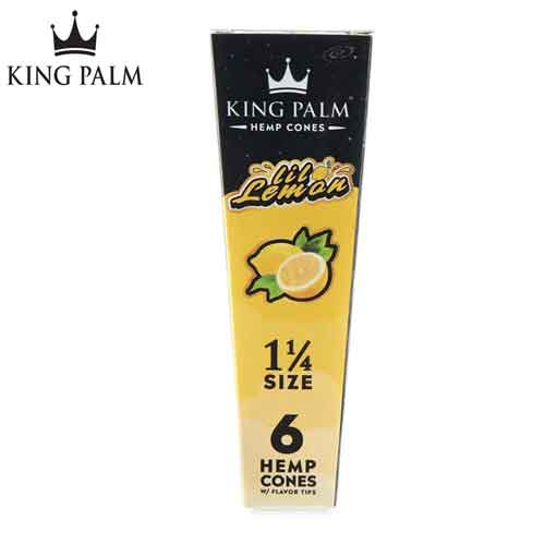 Les cônes pré-roulés King Palm Hemp sont équipés d’un filtre et d’une perle de saveur qui éclate pour activer le goût. Ce sont des cônes de taille king fabriqués en papier de chanvre naturel avec un embout en papier contenant une perle de saveur à l’intérieur. Des terpènes naturels de fruits sont infusés dans la perle de saveur. Saveur Citron.