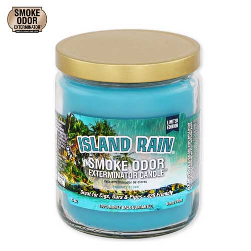 The Smoke Odor Exterminator Candles with the scent of Island Rain offer a tropical fragrance blend of rain soaked palms, bold eucalyptus, soft lavender and sweet hyacinth with a touch of cedar and tonka bean.